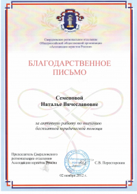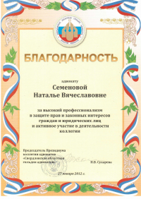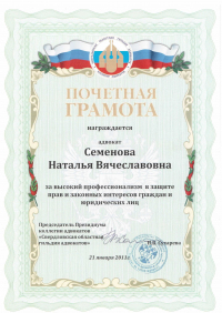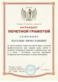 Безупречная работа в статусе адвоката с 2002 года. Положительные отзывы. Периодическое повышение квалификации. Грамоты, благодарности.