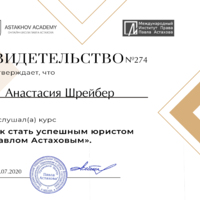 Участвую во всероссийских научно-практических конференциях, пишу научные статьи. В 2020 году я прослушала курс Павла Астахова "как стать успешным юристом"